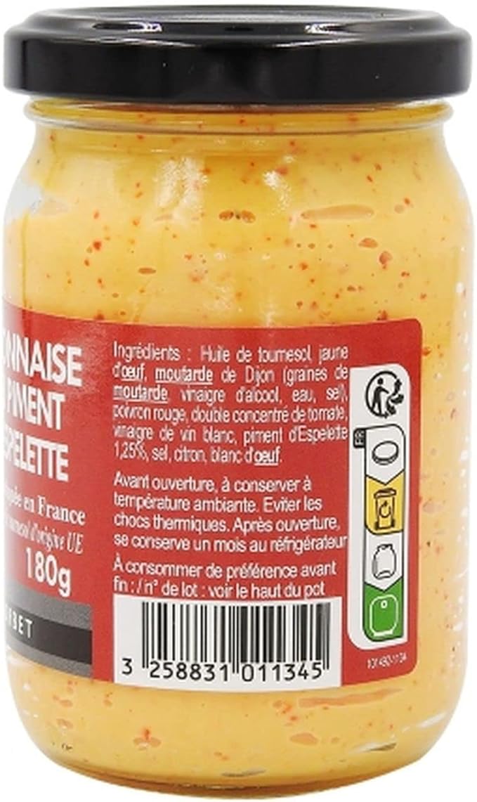 Olej słonecznikowy, żółtko jaja, musztarda Dijon (nasiona musztardy, ocet alkoholowy, woda, sól), czerwona papryka, podwójny koncentrat pomidorowy, ocet winny, chili Espelette (1,25%), sól, cytryna, białko jaja.