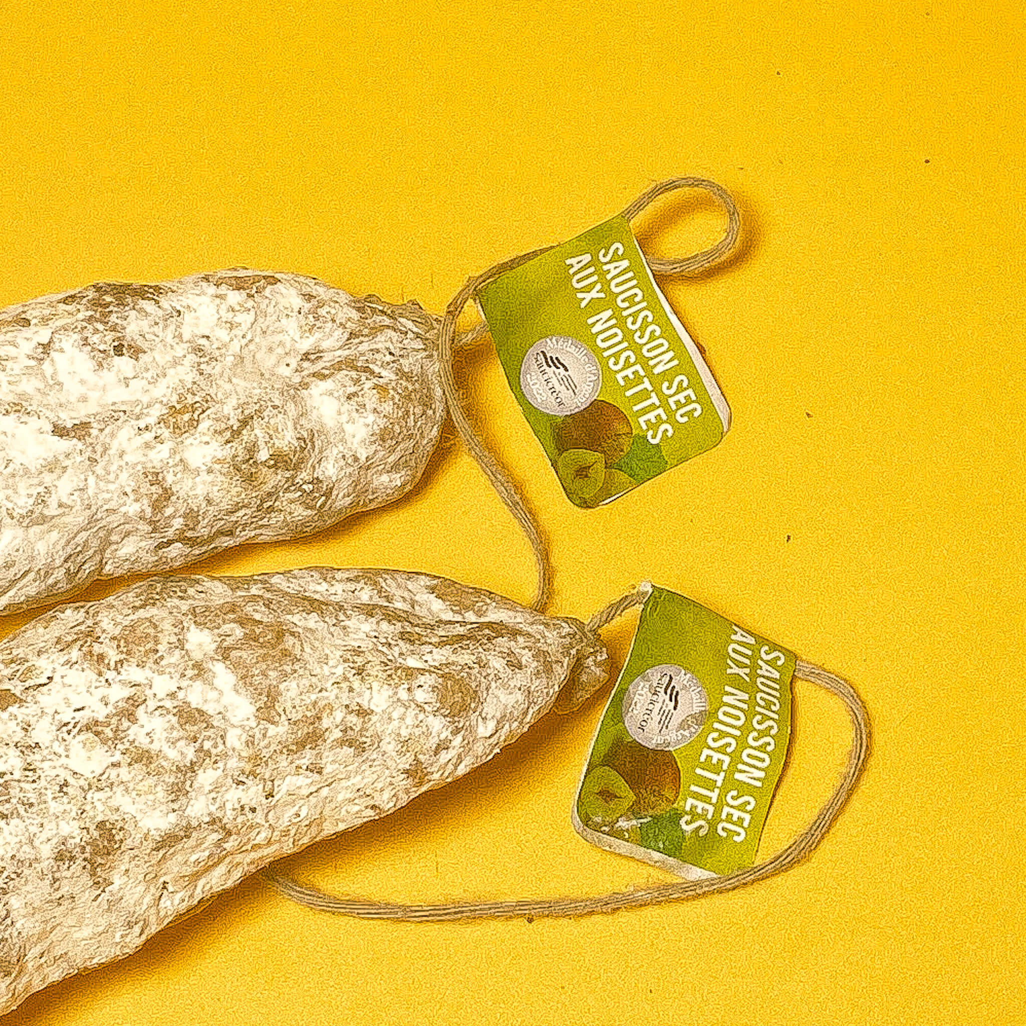 Saucisson, to rodzaj francuskiej kiełbasy, którą wytwarza się z mięsa wieprzowego, oraz cielęcego lub jeleniego. Często suszony i ma ostry smak, a także wiele różnych odmian, w zależności od regionu i tradycji. Saucisson spożywa się jako przekąska lub jako dodatek do sałatek i innych potraw. Jest to popularny produkt w kuchni francuskiej i jest szeroko dostępny w krajach francuskojęzycznych i poza nimi. Saucissons z orzechem laskowym to specjalny rodzaj kiełbasy, który jest wytwarza się przez dodanie orzechów laskowych do tradycyjnej mieszanki mięsa i przypraw. Ten dodatek nadaje kiełbasie wyjątkowego smaku i tekstury, który cenią miłośnicy kuchni francuskiej.