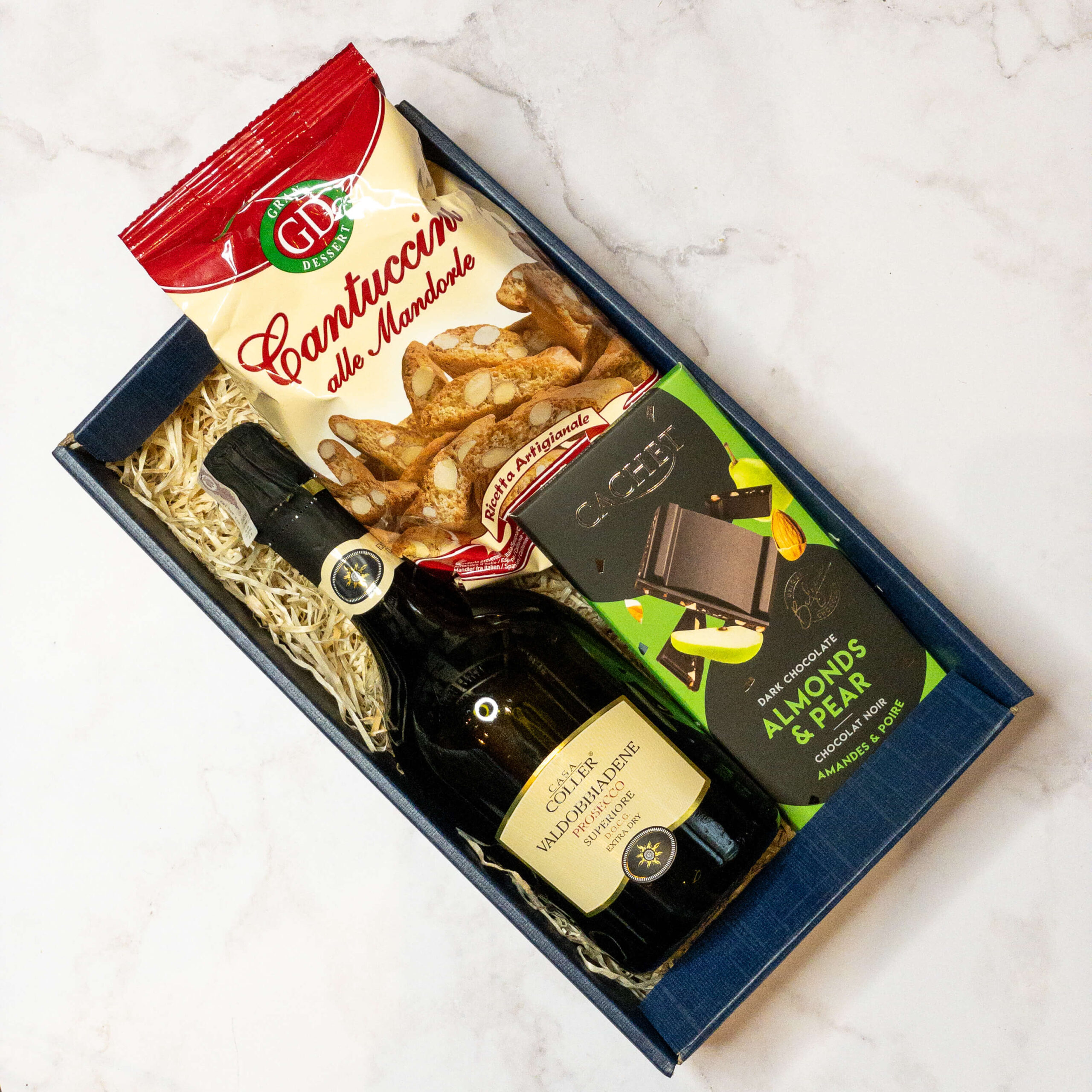 Rozpieszcz swoich bliskich unikalnym doznaniem z naszym wyjątkowym zestawem prezentowym, idealnym na różne okazje. Nasz zestaw łączy w sobie wykwintne włoskie smaki z nutą elegancji dzięki doskonałemu winu musującemu Prosecco. Dla każdego kto ceni znakomitej jakości słodkości oraz jest miłośnikiem win musujących przygotowaliśmy: