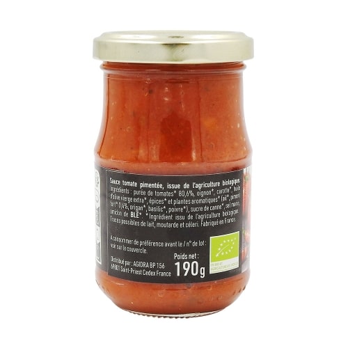 Skład: przecier pomidorowy*, cebula*, marchew*, oliwa z oliwek extra virgin*. Przyprawy* i rośliny aromatyczne* (czosnek*, ostra papryka*, oregano*, bazylia*, pieprz*). Cukier trzcinowy*, sól morska, skrobia pszenna* .