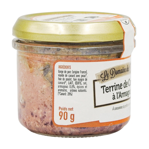 Gardło wieprzowe, mięso z kaczki ze skórą*, wątróbka drobiowa, chuda wątróbka kacza*, MLEKO, JAJKA, sól, armaniak 0,8%, przyprawy i aromaty, aromaty naturalne.* kaczka 28%.