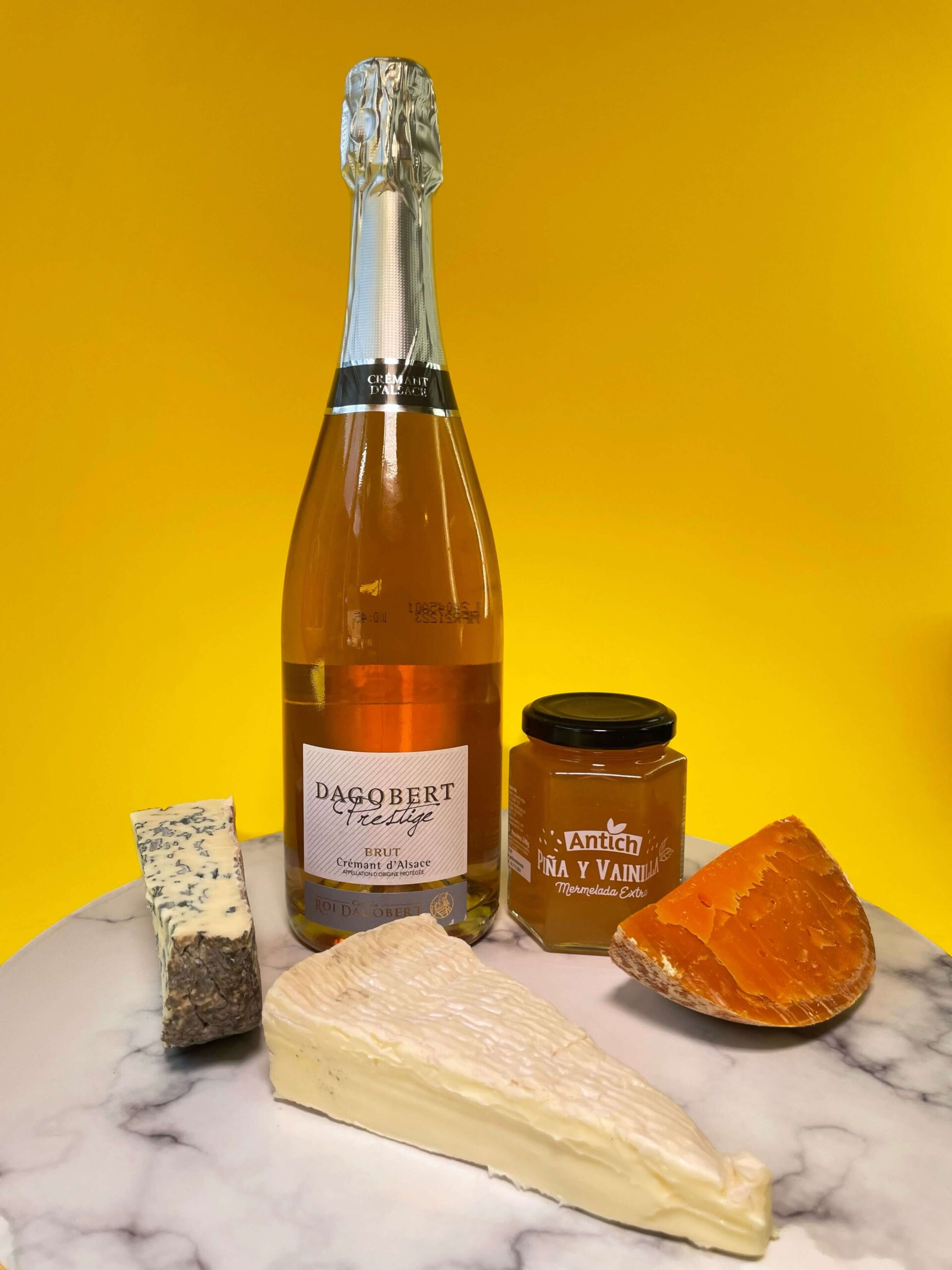 Zestaw Ferment to kompozycja smaków, która idealnie sprawdzi się na wyjątkowe okazje jak i również na prezent. Delikatny musujący Crémant Rosé d’Alsace Prestige Brut doskonale współgra z kremowym francuskim serem Brie oraz dojrzewającym, orzechowym Mimolette. Intensywny ser pleśniowy Fourme d’Ambert nadaje całości wyrafinowany charakter, a hiszpańska marmolada ananasowo-waniliowa wnosi słodki akcent. Chrupiące włoskie grissini z oliwą z oliwek idealnie dopełnia ten zestaw.