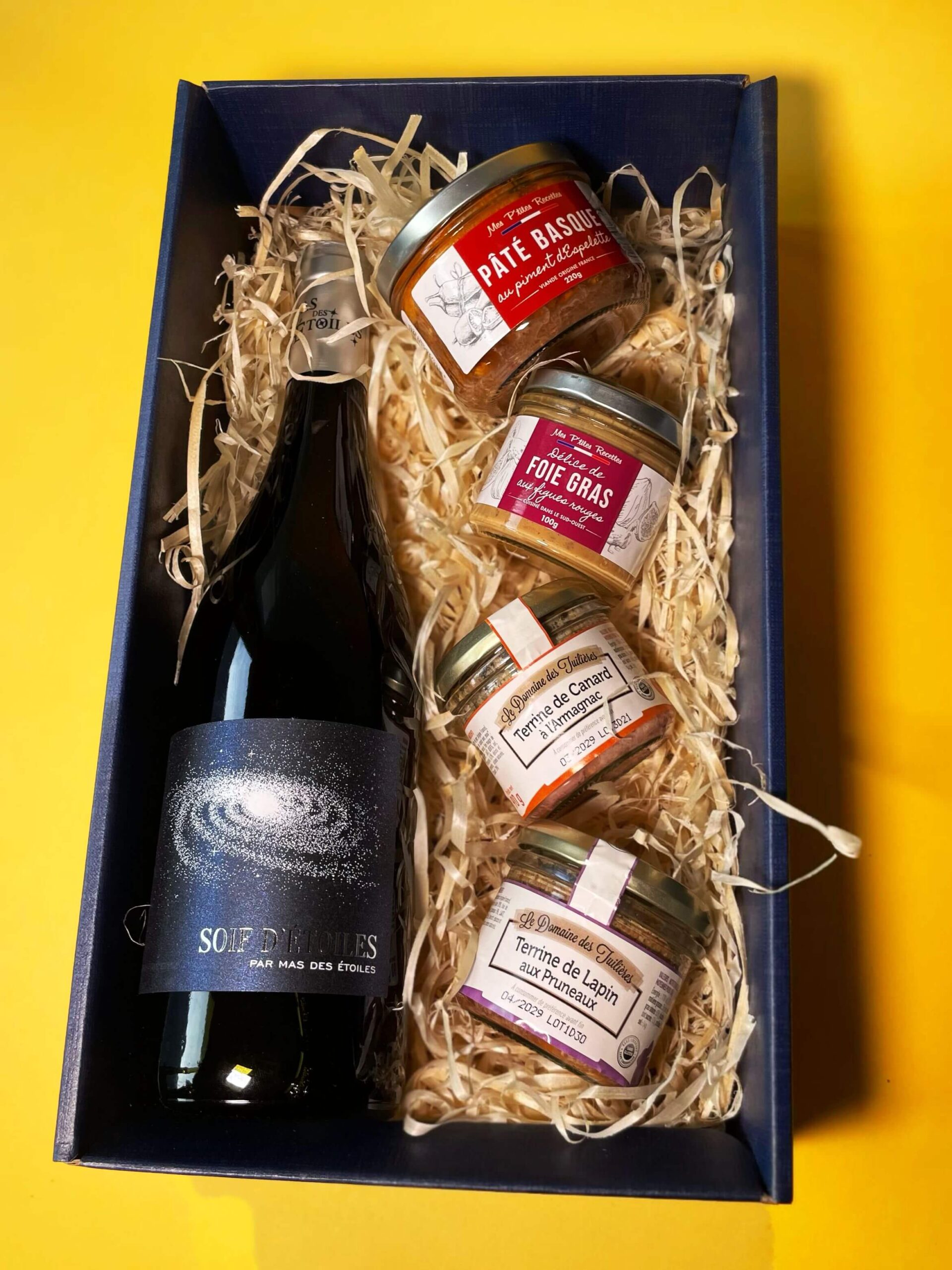 1. Czerowne Wino Francuskie IGP Côtes du Lot Soif d’étoiles Mas des Etoiles – to subtelne, francuskie wino z nutami czerwonych owoców, które doskonale łączy się z wyjątkowymi specjałami w zestawie. Jego delikatna struktura i elegancja podkreślają smaki terrin i foie gras, tworząc spójną całość.