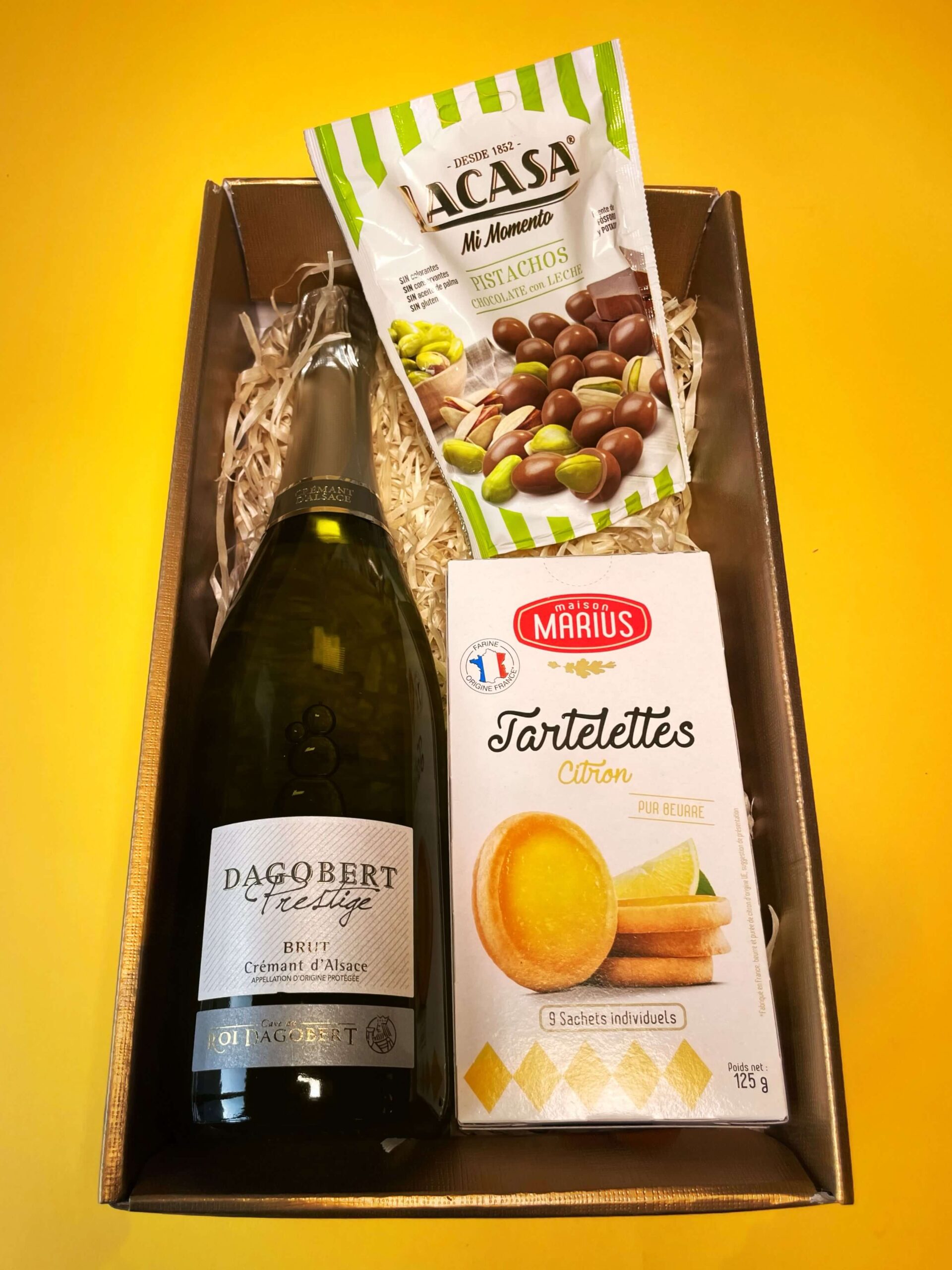 Zestaw słodkości z Cremantem białym – słodka uczta pełna różnorodnych smaków, idealna na wyjątkowe okazje lub relaksujące popołudnie. Crémant d’Alsace Prestige Brut zachwyca delikatnymi bąbelkami i świeżością, doskonale komponując się z nutami maślanych ciasteczek z cytrynową polewą. Pistacje w mlecznej czekoladzie łączą chrupiącą teksturę z kremową słodyczą czekolady. To zestaw, który zadowoli miłośników słodkich przyjemności. Będzie wspaniałym towarzyszem eleganckich chwil przy winie musującym. Idealny na prezent lub jako deserowy akcent.