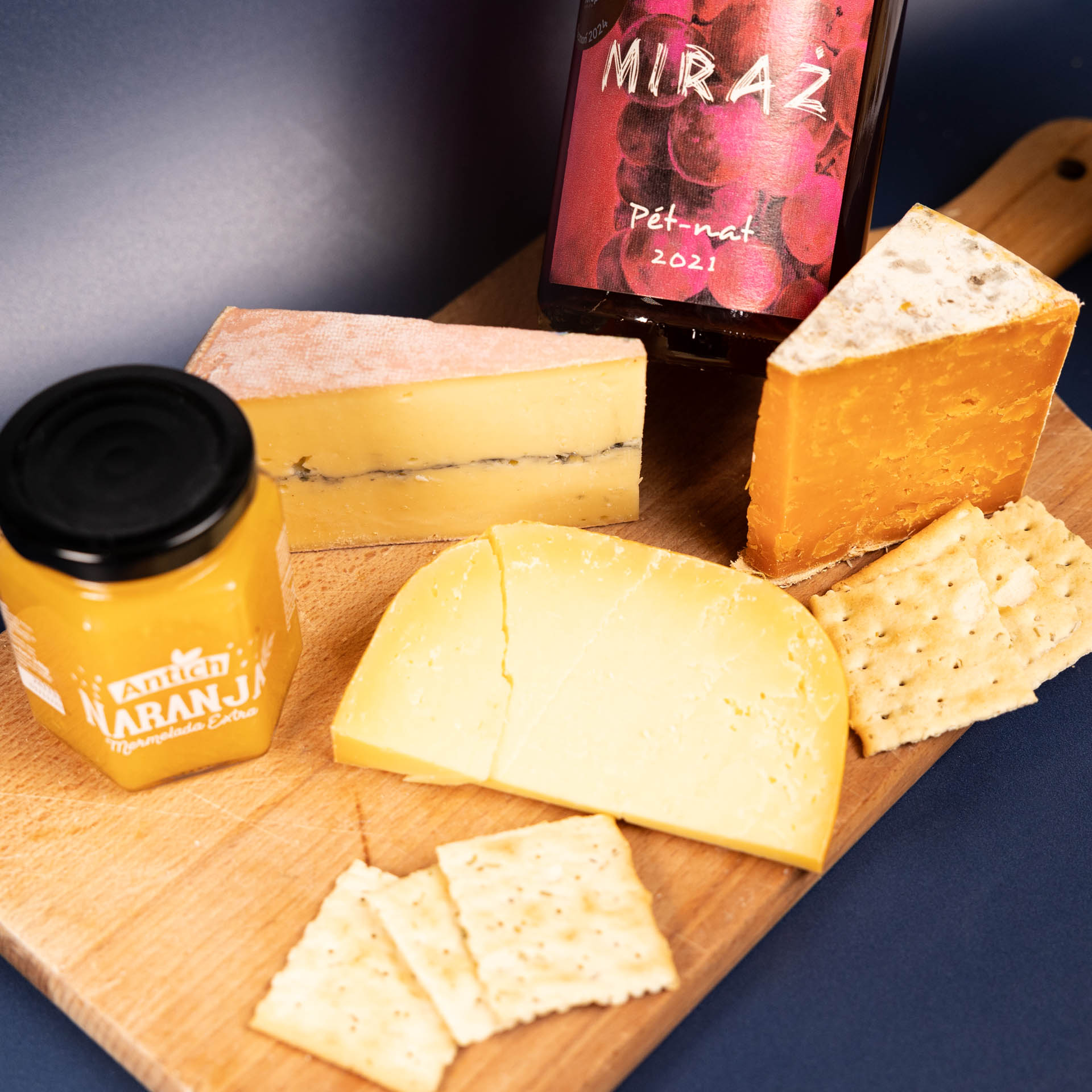 Delikatny ser Brie, kremowy Morbier AOP oraz łagodny Red Cheddar tworzą doskonałe połączenie, które wspaniale komponuje się z wytrawnym polskim różowym winem Miraz Pet-Nat. Zestaw idealny na wieczory w gronie najbliższych oraz również na prezent.