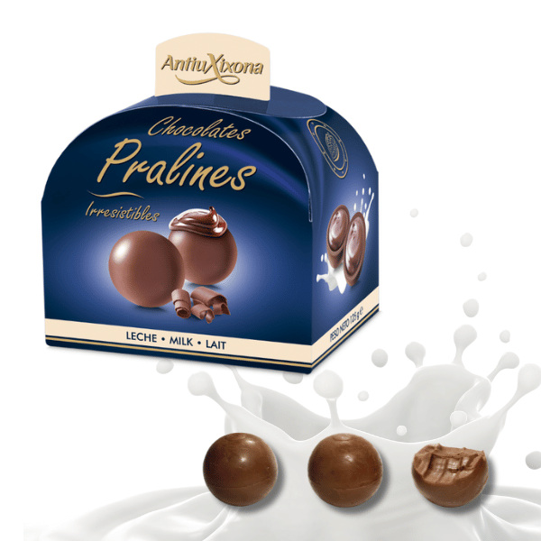 Rozkoszuj się hiszpańskimi pralinami Antiu Xixona z aksamitnym nadzieniem mlecznej czekolady – doskonałe na każdą okazję! Słodycz, która rozpływa się w ustach, idealna do kawy lub jako elegancki prezent.